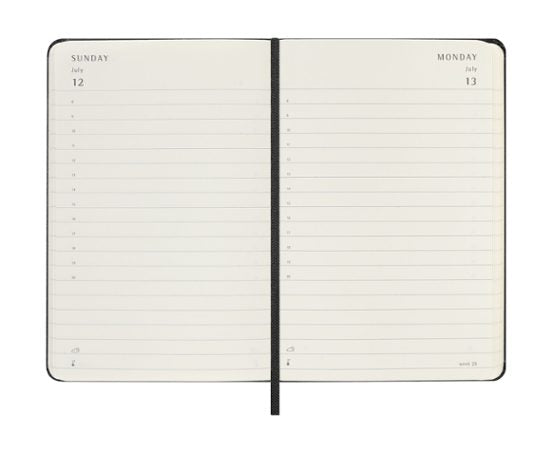 Agenda Pocket 2026 día página tapa dura Moleskine en color negro. Una página por día de enero a diciembre 2026. Cierre con goma y cinta marcadora. Contiene herramientas útiles: calendario, planificación de viajes, ideas y objetivos, páginas a rayas para notas. Año grabado en la cubierta delantera. 400 páginas. Esquinas redondeadas. Bolsillo interior expandible. Apertura 180 grados. Incluye una hoja con adhesivos del alfabeto, dos hojas de adhesivos de iconos y adhesivos del año para el lomo. Papel certificado FSC. Tamaño Pocket 9x14 cm.