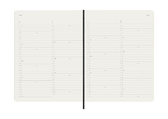 Agenda Extralarge 2026 mes vista tapa blanda Moleskine en color negro. Planificador mensual en 2 paginas seguidas de 2 paginas hojas para anotaciones. Cierre con goma y cinta marcadora. Contiene herramientas útiles: calendario, planificación de viajes, ideas y objetivos, páginas a rayas para notas. Año grabado en la cubierta delantera. 128 páginas. Esquinas redondeadas. Bolsillo interior expandible. Apertura 180 grados. Incluye una hoja con adhesivos del alfabeto, dos hojas de adhesivos de iconos y adhesivos del año para el lomo. Papel certificado FSC. Tamaño Extralarge 19x25 cm.
