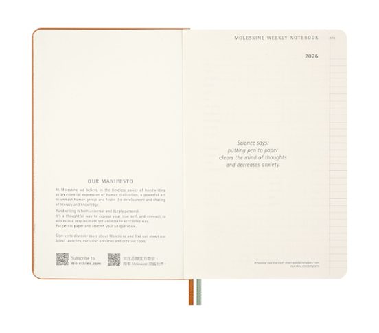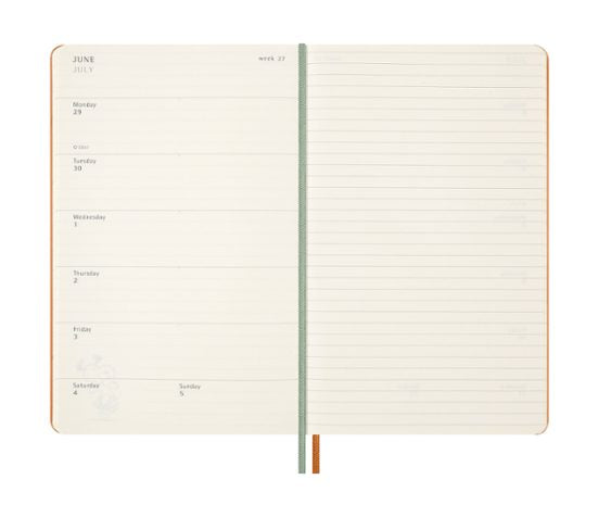 Agenda Large 2026 semana vista tapa dura Moleskine edición limitada Peanuts en color naranja. Página izquierda planificador semanal y pagina derecha hoja rayada para anotaciones. Cierre con goma y cinta marcadora. Contiene herramientas útiles: calendario, planificación de viajes, ideas y objetivos, páginas a rayas para notas. Año grabado en la cubierta delantera. 144 páginas. Esquinas redondeadas, cierre con goma, dos cintas marcadoras y bolsillo interior expandible personalizado. Incluye marcapáginas y pegatinas para personalizar tus notas. Guardas y páginas personalizadas con temática Peanuts. Apertura 180 grados. Papel certificado FSC. Tamaño Large 13x21 cm.