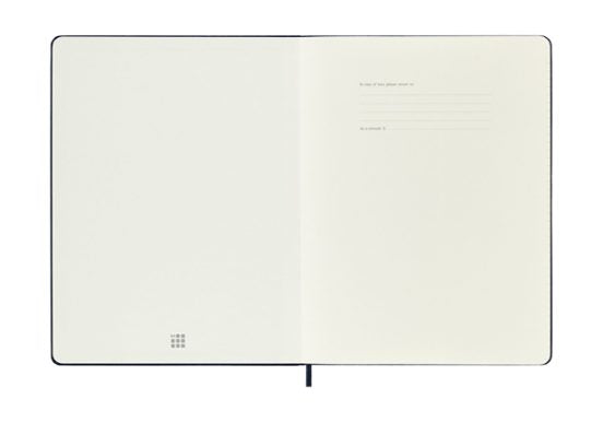Agenda Extralarge 2026 semana vista tapa dura Moleskine en color azul zafiro. Página izquierda planificador semanal y pagina derecha hoja rayada para anotaciones. Cierre con goma y cinta marcadora. Contiene herramientas útiles: calendario, planificación de viajes, ideas y objetivos, páginas a rayas para notas. Año grabado en la cubierta delantera. 144 páginas. Esquinas redondeadas. Bolsillo interior expandible. Apertura 180 grados. Incluye una hoja con adhesivos del alfabeto, dos hojas de adhesivos de iconos y adhesivos del año para el lomo. Papel certificado FSC. Tamaño Extralarge 19x25 cm.