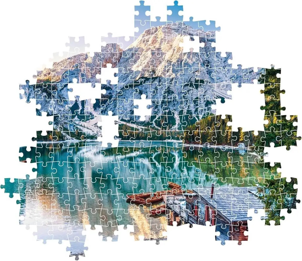 Puzzle de la marca Clementoni de 1000 piezas con imagen de un gran lago de azules aguas entre las montañas cubiertas de nieve. A la orilla del lago, se encuentra una pequeña cabaña de madera con un muelle y varias barcas amarradas en el.