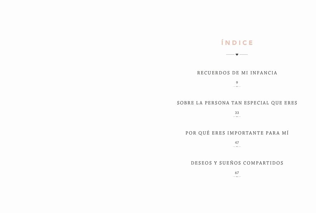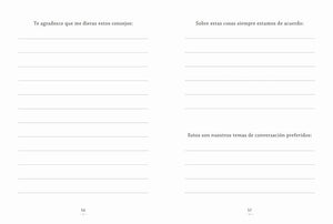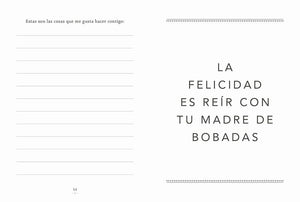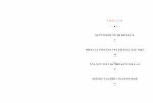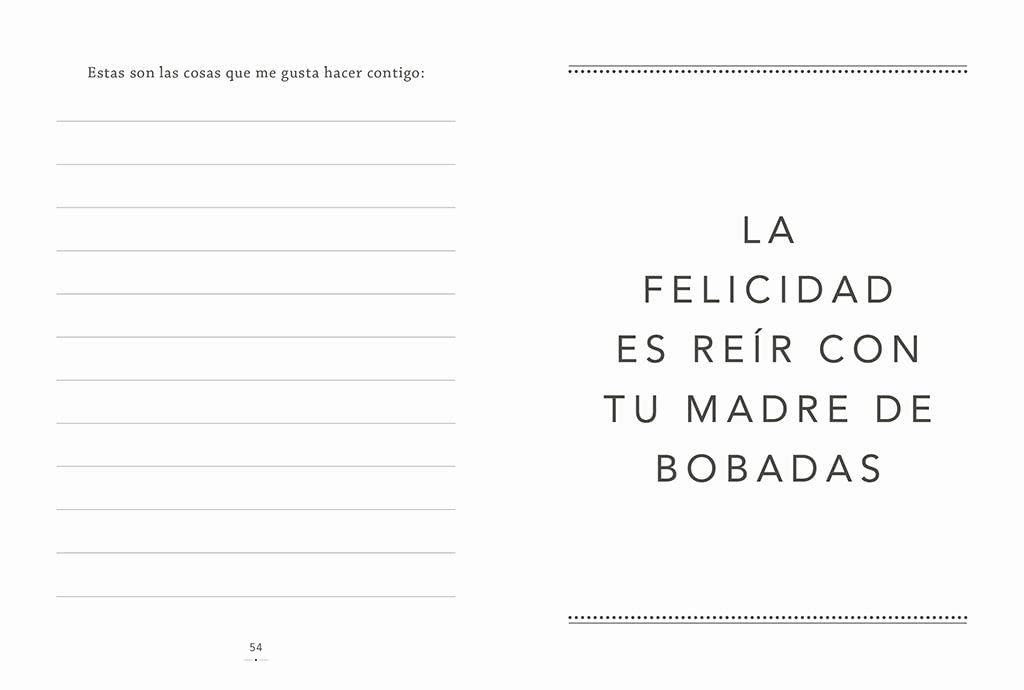 Dile a tu madre lo especial que es creando algo a partir de las experiencias que habéis compartido. La idea es sencilla y divertida y las posibilidades, infinitas, tan infinitas como tu deseo de hacerla feliz. Con este pequeño libro puedes contarle a tu madre todo lo que quieras. Comparte con ella los mejores momentos de tu infancia, escribe sobre lo que significa para ti, explícale tus sueños o cómo os veis en un futuro. Para hacerlo, solo tendrás que responder a divertidas preguntas y decidir con qué fotos, entre otras cosas, quieres viajar en el tiempo.