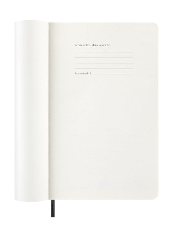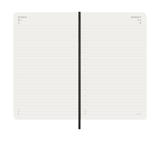 Agenda Large 2026 día página tapa blanda Moleskine en color negro. Una página por día de enero a diciembre 2026. Cierre con goma y cinta marcadora. Contiene herramientas útiles: calendario, planificación de viajes, ideas y objetivos, páginas a rayas para notas. Año grabado en la cubierta delantera. 400 páginas. Esquinas redondeadas. Bolsillo interior expandible. Apertura 180 grados. Incluye una hoja con adhesivos del alfabeto, dos hojas de adhesivos de iconos y adhesivos del año para el lomo. Papel certificado FSC. Tamaño Large 13x21 cm.