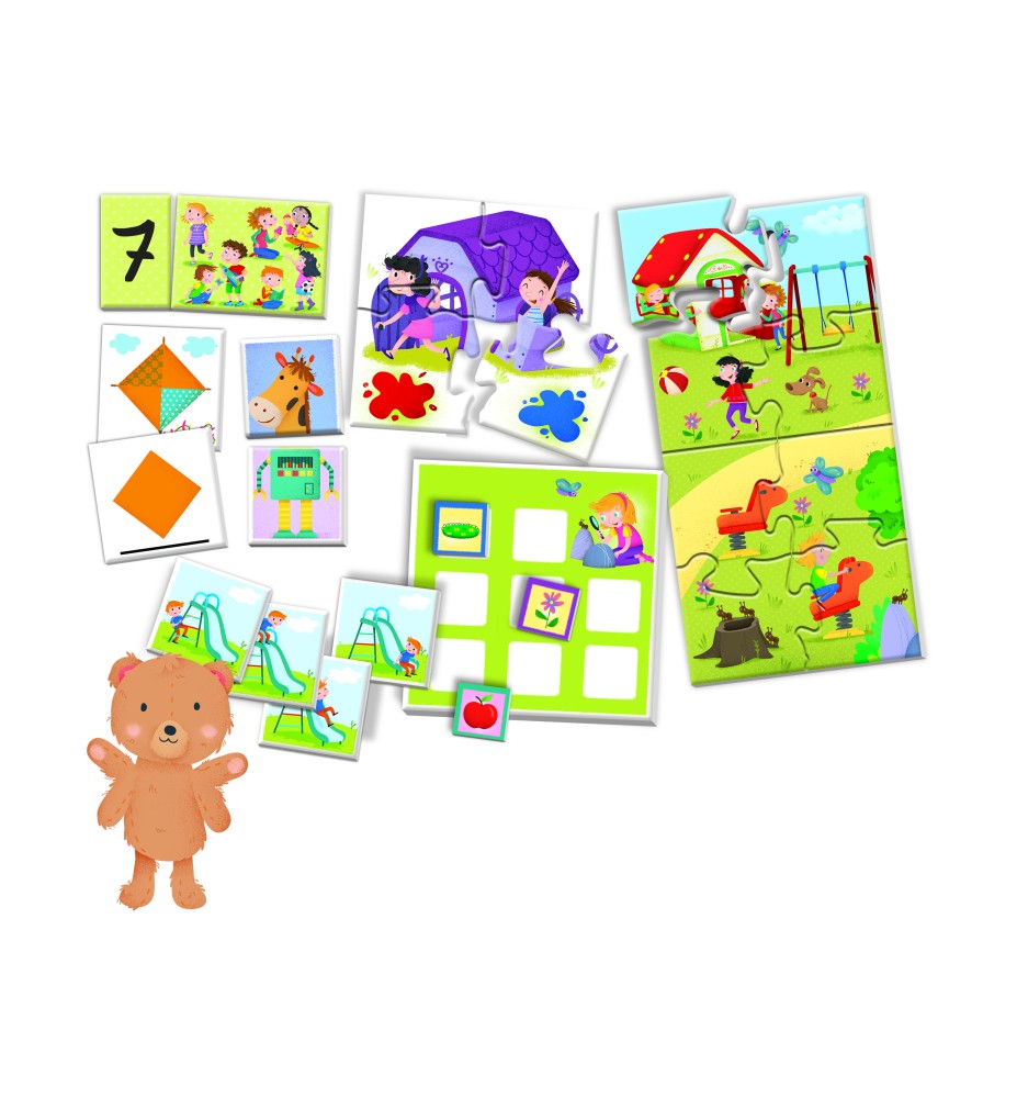 Cada actividad está diseñada con materiales resistentes y seguros, adaptados a las manos pequeñas y con colores vivos que captan la atención de los niños. Además, las ilustraciones y componentes fomentan la interacción, haciendo que el aprendizaje sea más atractivo y dinámico. Con este set, los niños pueden jugar solos o en compañía, lo que también potencia la socialización, el trabajo en equipo y la sana competencia.