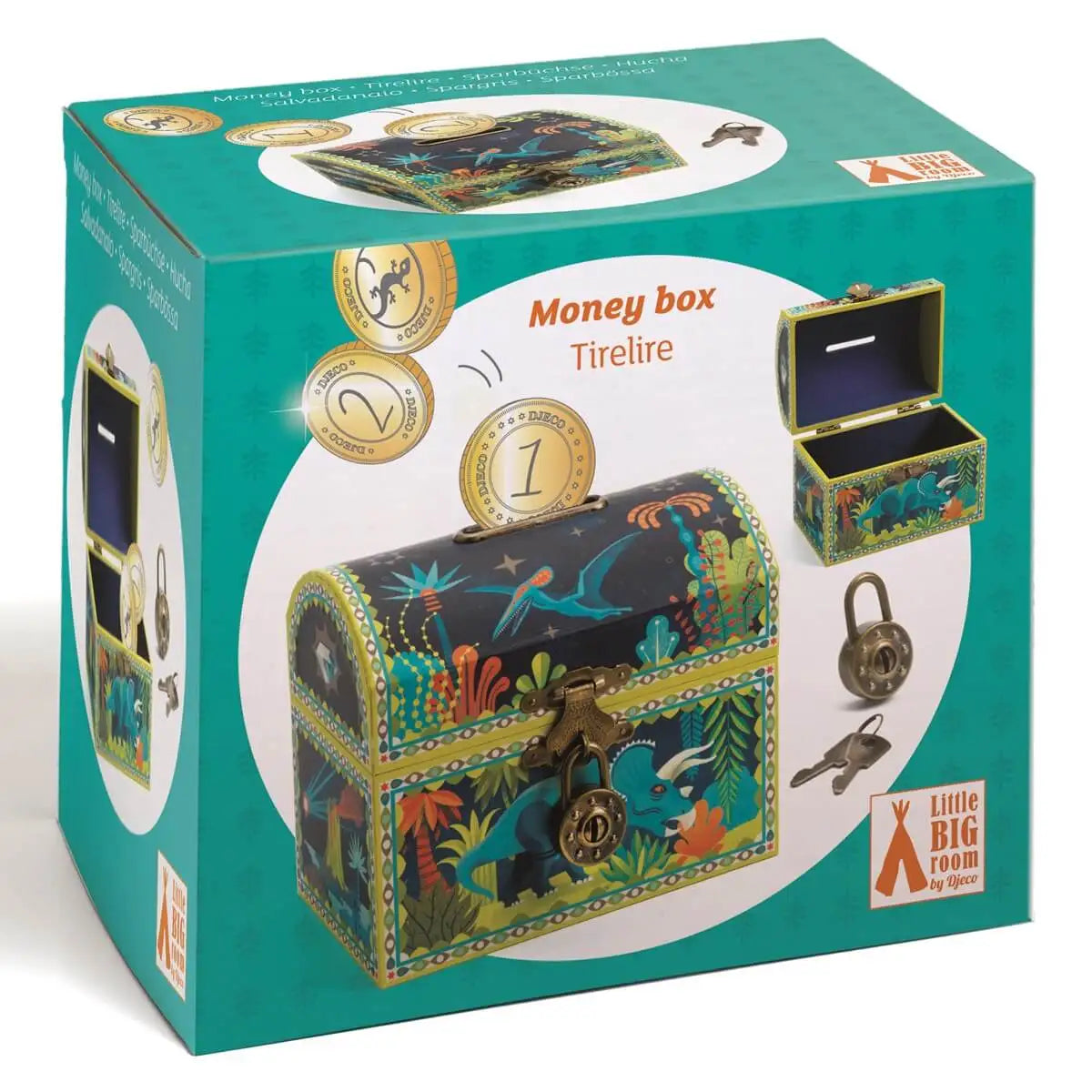 Descubra esta magnífica hucha que también sirve como cofre del tesoro. Un bonito objeto decorativo con ilustraciones de dinosaurios: un complemento perfecto para la habitación de su hijo. La hucha, que se cierra con llave de forma segura, viene con 2 llaves para que pueda acceder a todo el dinero que ha ahorrado.