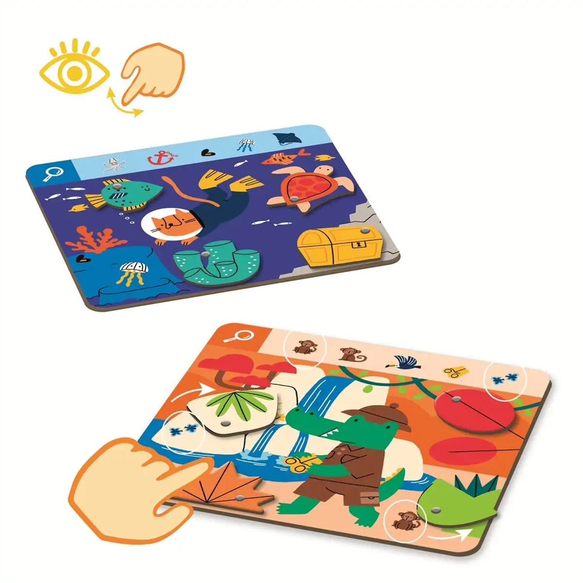 ¡Un primer juego de buscar y encontrar original, divertido y lleno de acción! Con 6 tableros con ruletas móviles, cada juego está lleno de descubrimiento y acción. Un verdadero juego de escondite, ¡las imágenes cobran vida al alcance de la mano del niño!