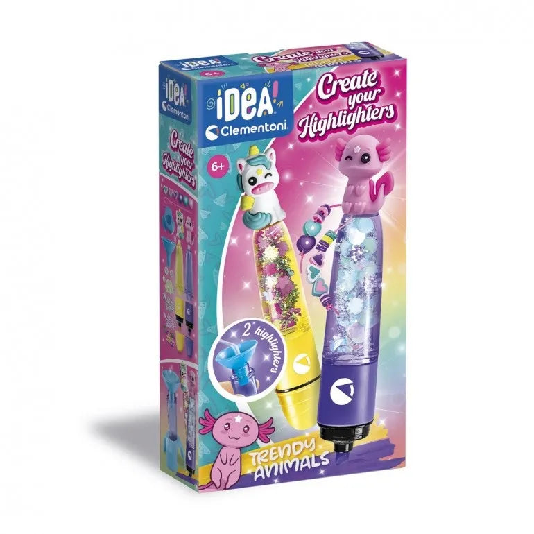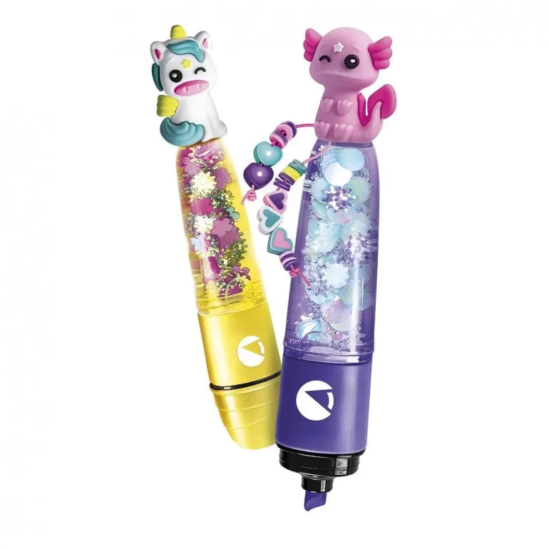 Un original kit creativo que permite montar 2 subrayadores y personalizarlos con diferentes decoraciones, eligiendo entre 3 temas diferentes. Un kit práctico y completo compuesto por: 2 subrayadores, tintas de colores diferentes y todas las herramientas para crearlas. Este nuevo juego permite crear y personalizar los subrayadores con una gran variedad de accesorios y decoraciones.