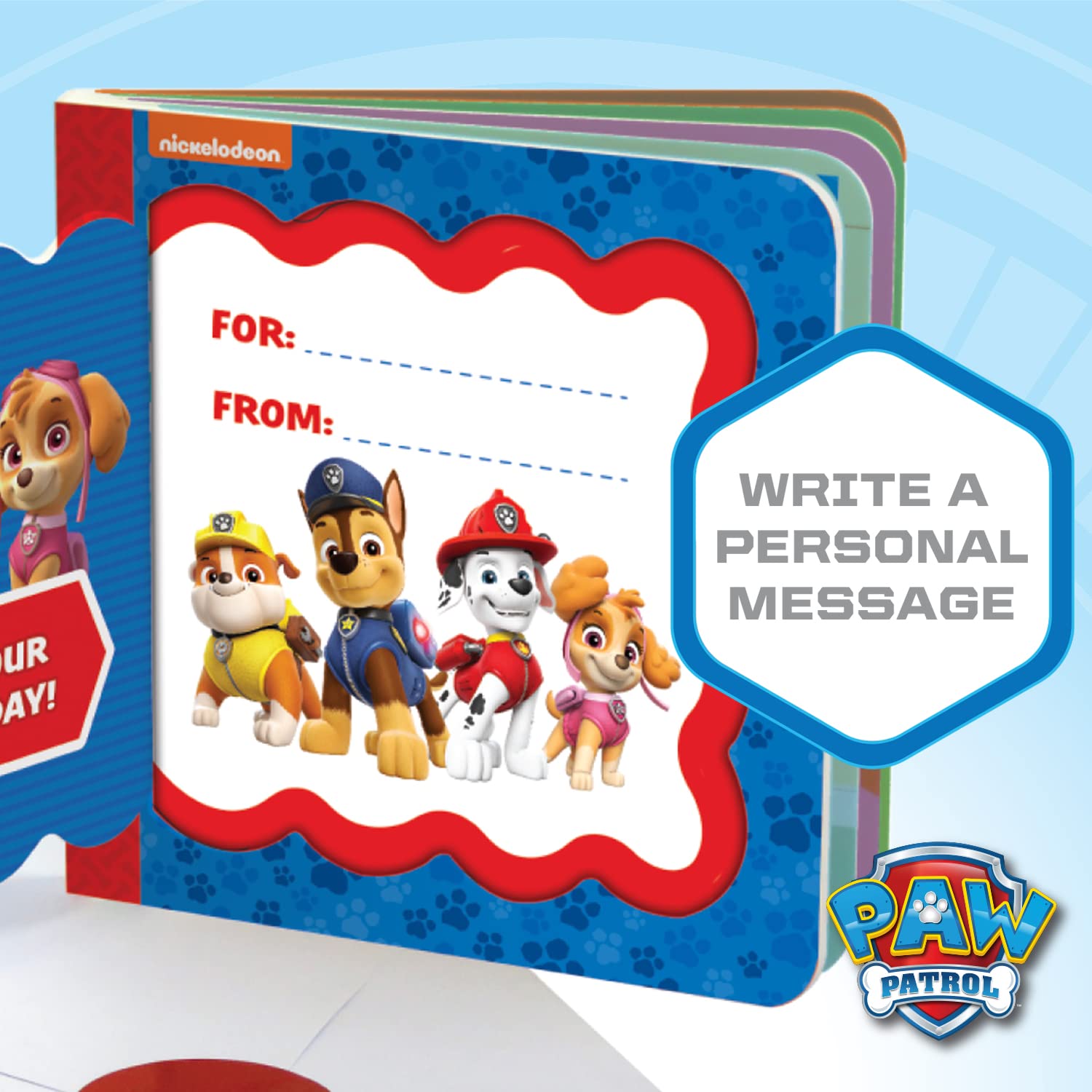 Birthday card that's a board book has big flap on cover to write names and birthday wishes! Kids who love PAW Patrol will read this birthday greeting book again and again! Bring a book instead of a card! Includes favorite PAW Patrol Pups Chase, Marshall, Skye, and Rubble. Great for a PAW Patrol birthday party for any age boy or girl. Open the front cover flap to personalize the birthday book. Make it a Happy PAWsome Birthday!