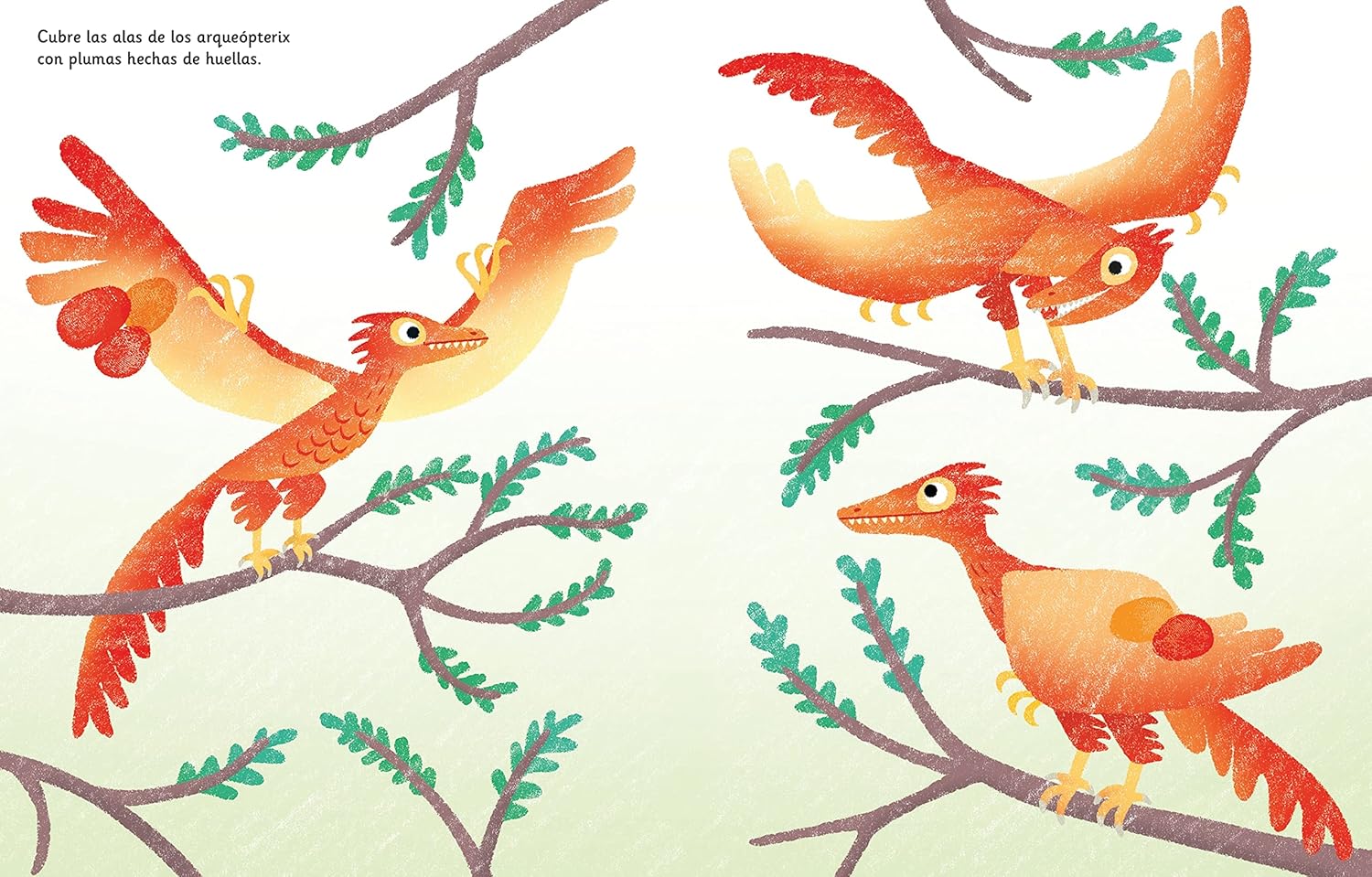 Simplemente mojando las yemas de los dedos en la tinta y apoyándolas en las páginas, los pequeños artistas añadirán escamas al lomo de un estegosaurio, decorarán un diplodocus o dibujarán los dientes de un tiranosaurio-Rex.
