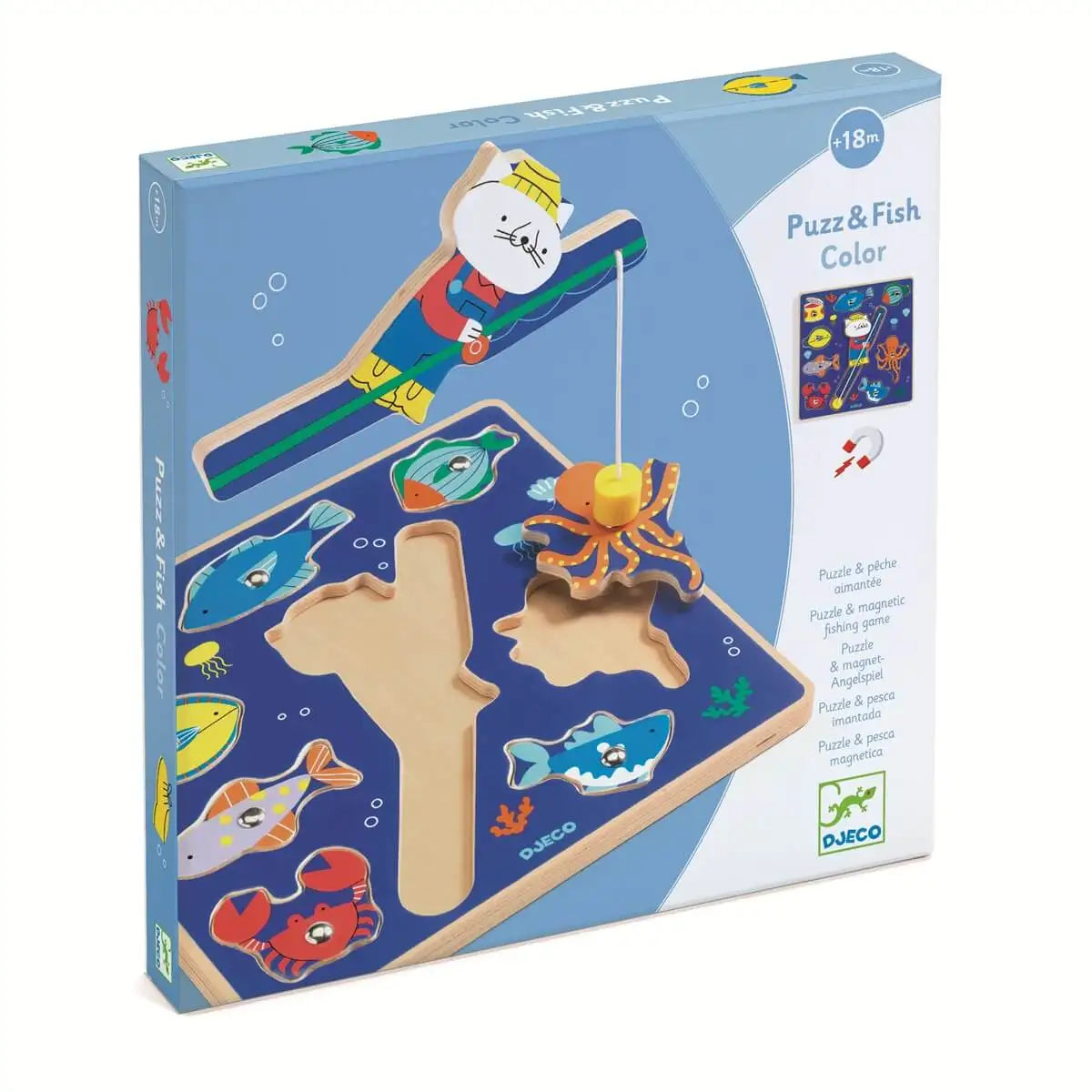 Puzz & Fish es un juego 2 en 1: un rompecabezas de madera y un juego de pesca. La caña de pescar magnética está sujeta por un gato. El niño atrapa el pez usando al gato y luego coloca las piezas en su lugar en la base