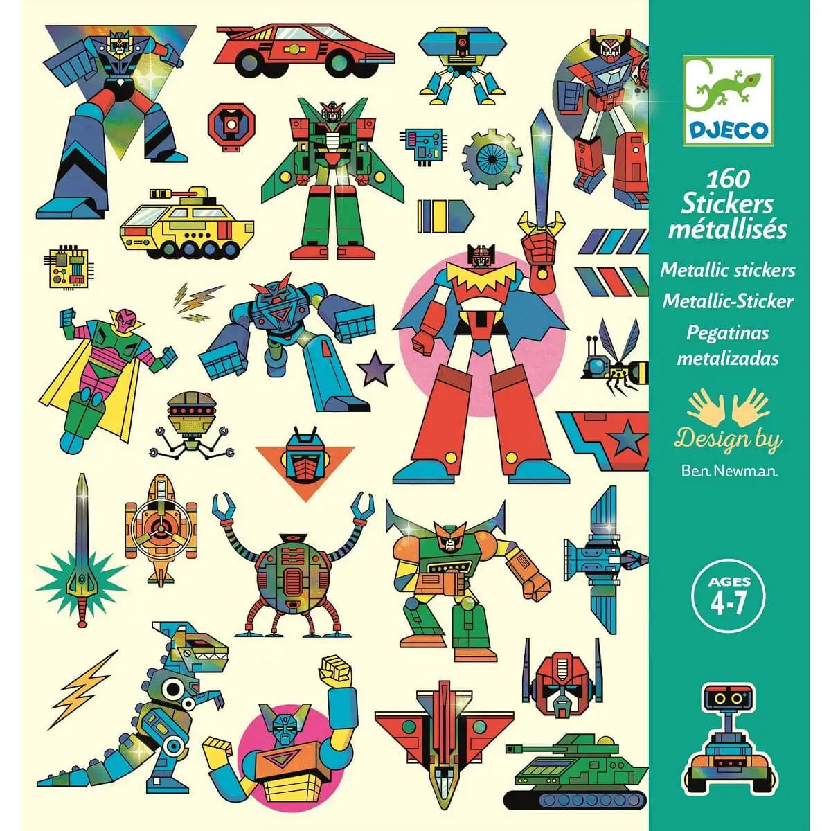 Un bolsillo con 160 pegatinas metálicas con temática de robots. Robots retro Mecha Manga, droides con armaduras brillantes, drones futuristas… ¡¡hay algo para todos los gustos!! ¡Pega las numerosas pegatinas como quieras y crea tus propias escenas o decora lo que quieras!